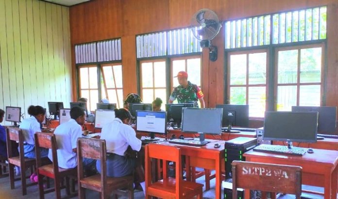 Waropen-Suaraindonesia1. Id. Berlokasi di Gedung Sekolah SMA Negeri Marikai Distrik Waropen Atas Kabupaten Mamberamo Raya, Sersan Dua Jainul Abidin Babinsa Koramil 1709-05/Waropen Atas Kodim 1709/Yawa, bersama-sama dengan Tenaga Pengajar (Guru) melakukan pendampingan kepada siswa/i dalam mengikuti Bimbingan Teknis Persiapan Ujian Akhir Nasional (UAN) secara online, Selasa (30/08/2022).