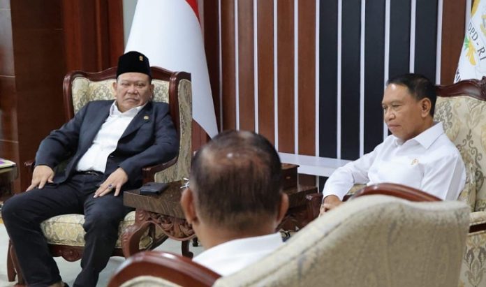 JAKARTA – Ketua DPD RI, AA LaNyalla Mahmud Mattalitti, menerima audiensi Menteri Pemuda dan Olahraga (Menpora), Zainuddin Amali, dan Ketua Umum KONI Pusat, Letjen TNI (Purn) Marciano Norman, Kamis (14/4/2022). Ketiganya membahas kiprah dan prestasi olahraga Muaythai di Indonesia. Mereka juga menyoroti problematika yang terjadi di internal Pengurus Besar (PB) Muaythai Indonesia.