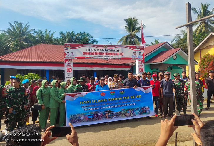 Danramil 428-04 Pondok Suguh Kapten F Barus, yang mewakili Komandan Kodim Kodim 0428 Mukomuko, Letkol Inf Yokki Firmansyah, mengatakan Karya Bakti dan Bakti Sosial menyambut HUT TNI ke 80 untuk manunggal bersama rakyat.