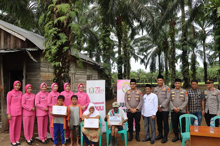 Kapolres Mukomuko AKBP Riky Crisma Wardana, S.I.K., dan Ketua Bhayangkari Cabang Mukomuko, Ny. Ria Riky, mereka menyerahkan bantuan kepada Tuslim (73), warga Desa Lubuk Sanai II, Kecamatan XIV Koto.