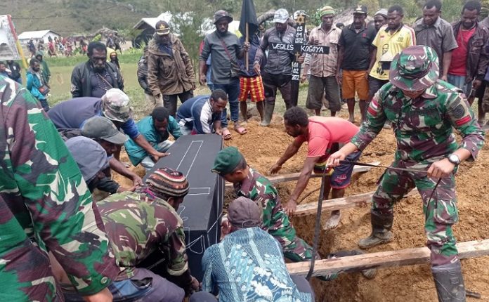Suaraindonesia1-Lanny Jaya, Papua – Sebagai wujud rasa belasungkawa dan peduli sesama, Prajurit Satgas Yonif MR 412 Kostrad dari Pos Malagayneri hadir dan membantu prosesi pemakaman jenazah warga yang meninggal dunia atas nama Bapak Wegiles Kogoya karena sakit, pemakaman sendiri dilakukan di Desa Lowanom Distrik Malagayneri Kabupaten Lanny Jaya.